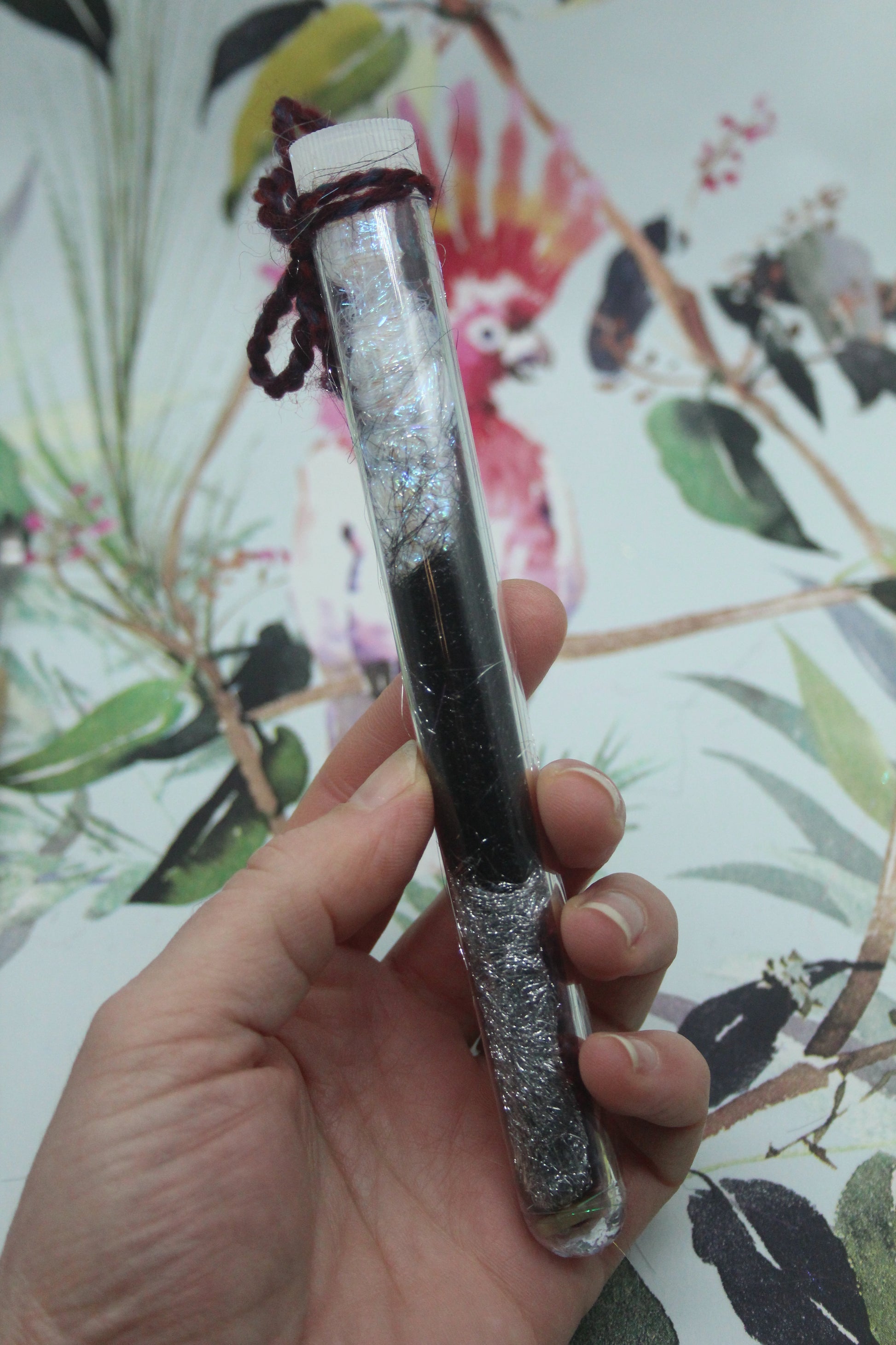 Use the string (which has a button at the bottom of the test tube) to pull up the bottom fibres. You can reuse the test tube for other projects or storing things like beads.