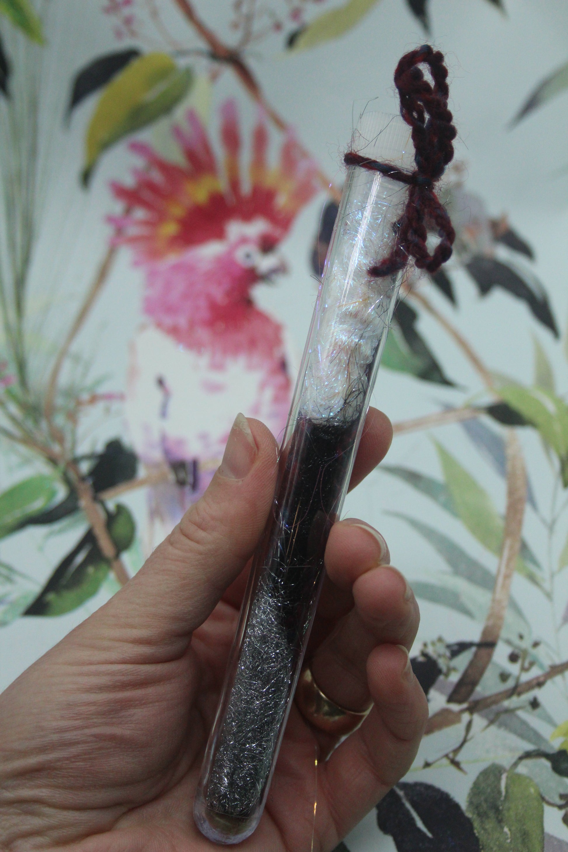 This fabulous fibre is angelina and can be used to add sparkle to your projects. I personally use this to blend into my wool mixes. It won't felt by itself but you can trap it with wool. You will receive 2 grams of fibre in a plastic test tube.
