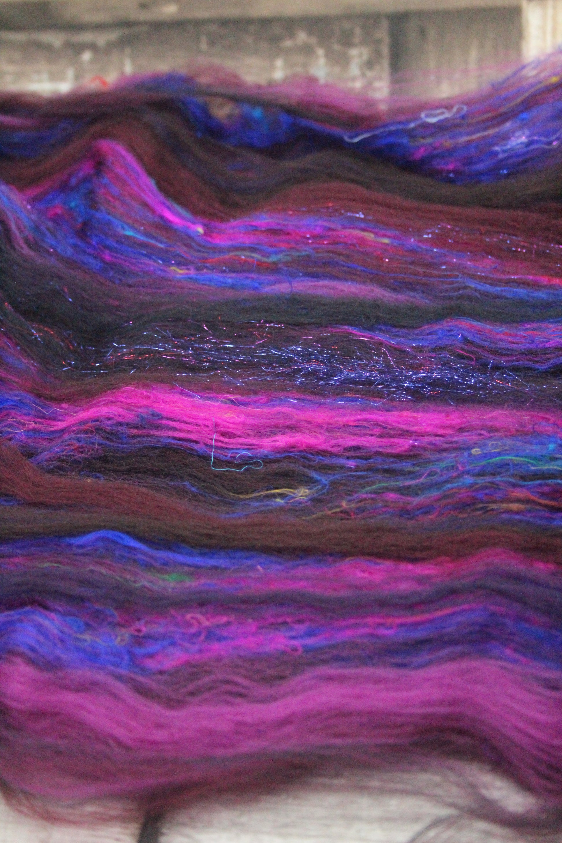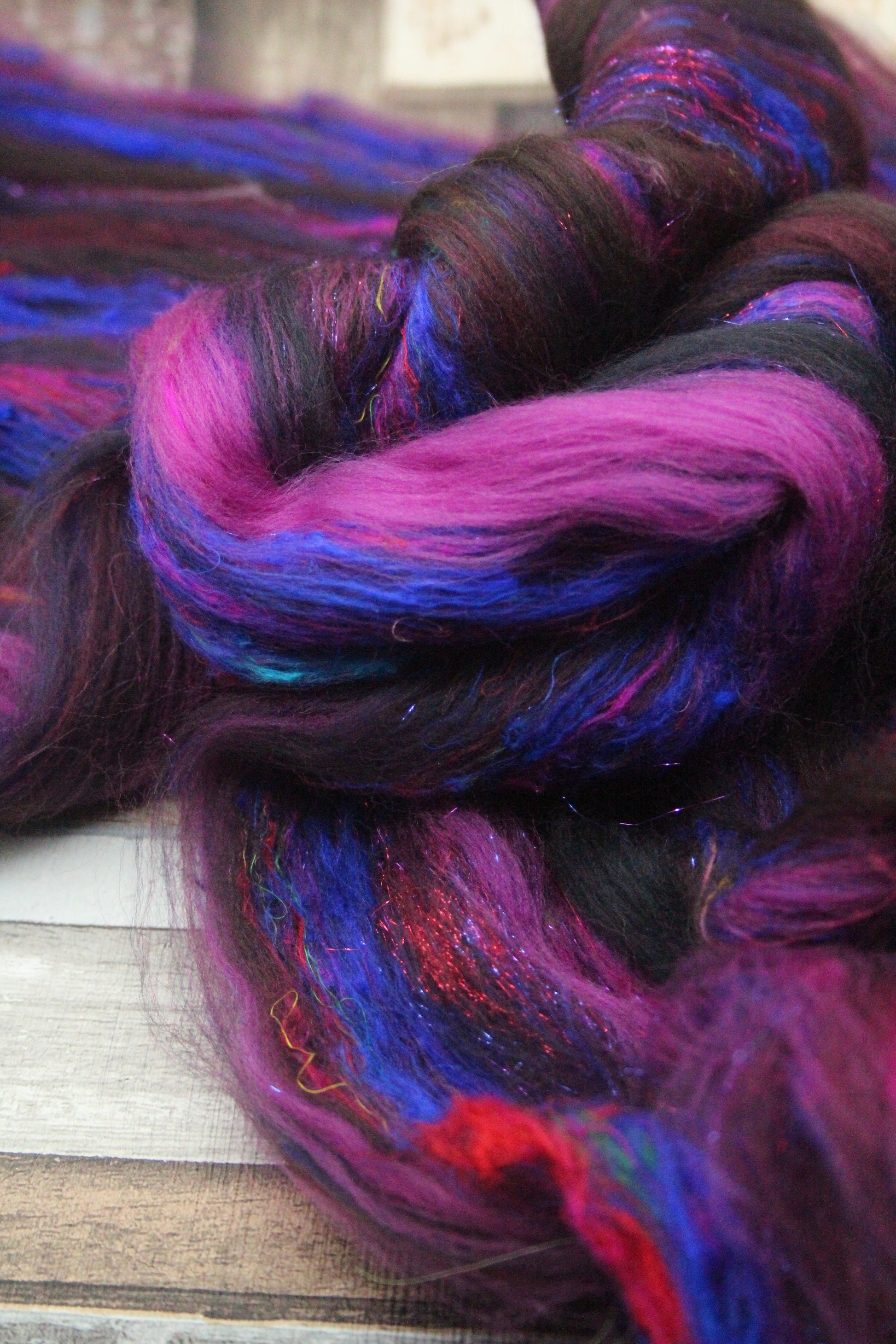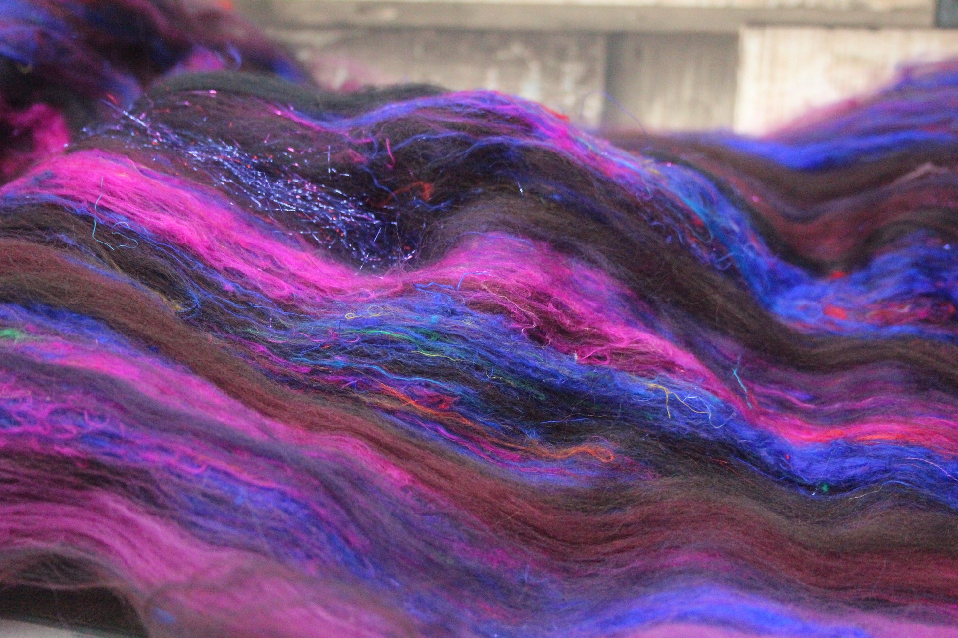 This is a batt that I have created by drum carding wool and speciality fibres. This would be perfect for so many projects - leave it whole and wet felt to create a beautiful background for embellishing, split and hand spin into a beautiful yarn, pull sections off and lay them down for wet felting into something fantastic like a bag, needle felt a fun 3D creature, weave into a wall hanging....