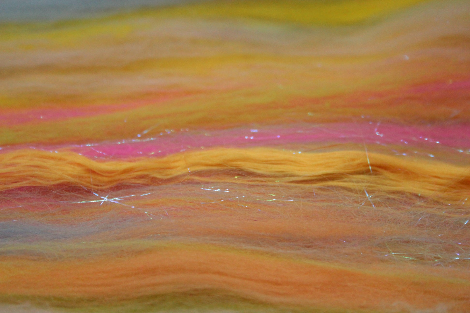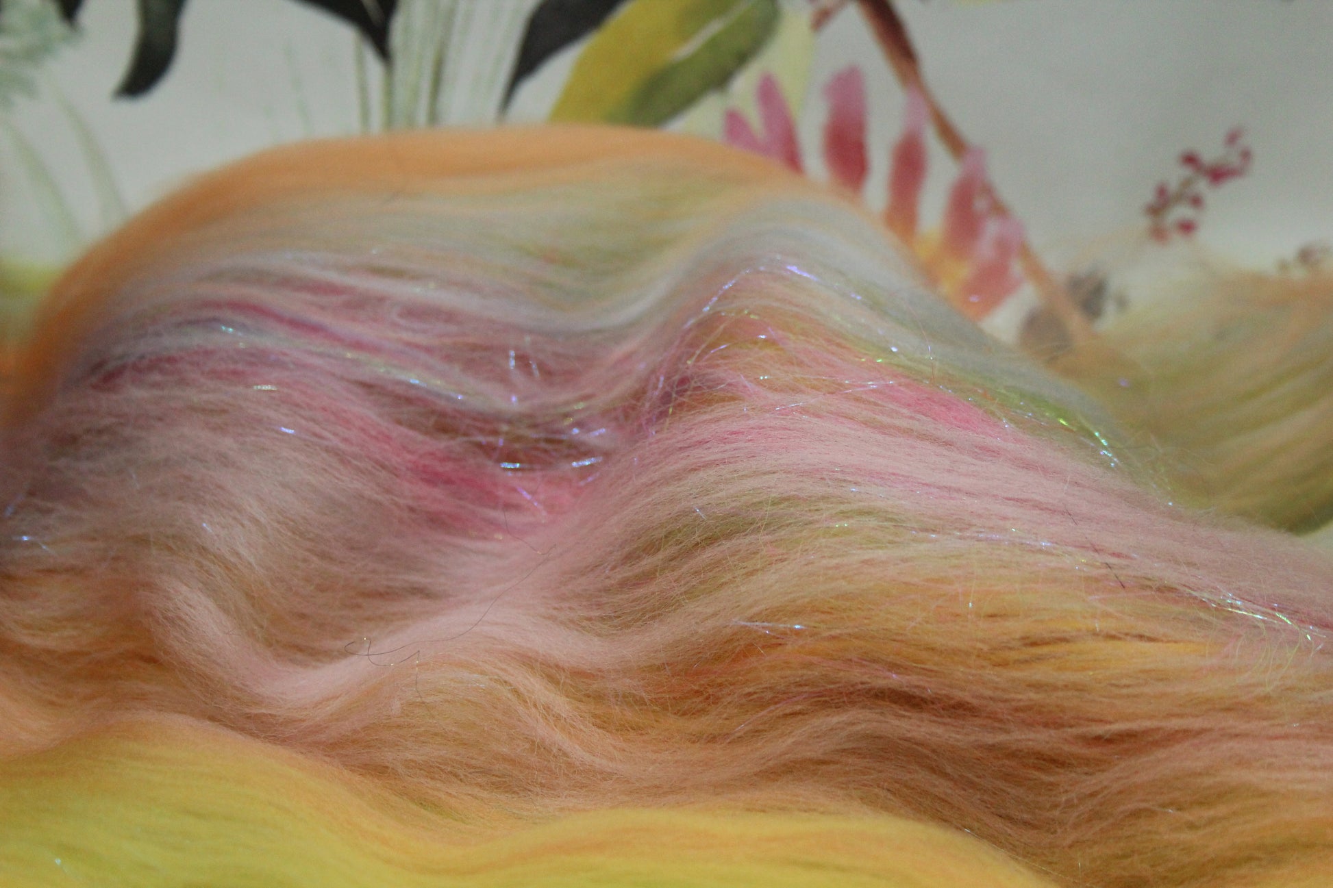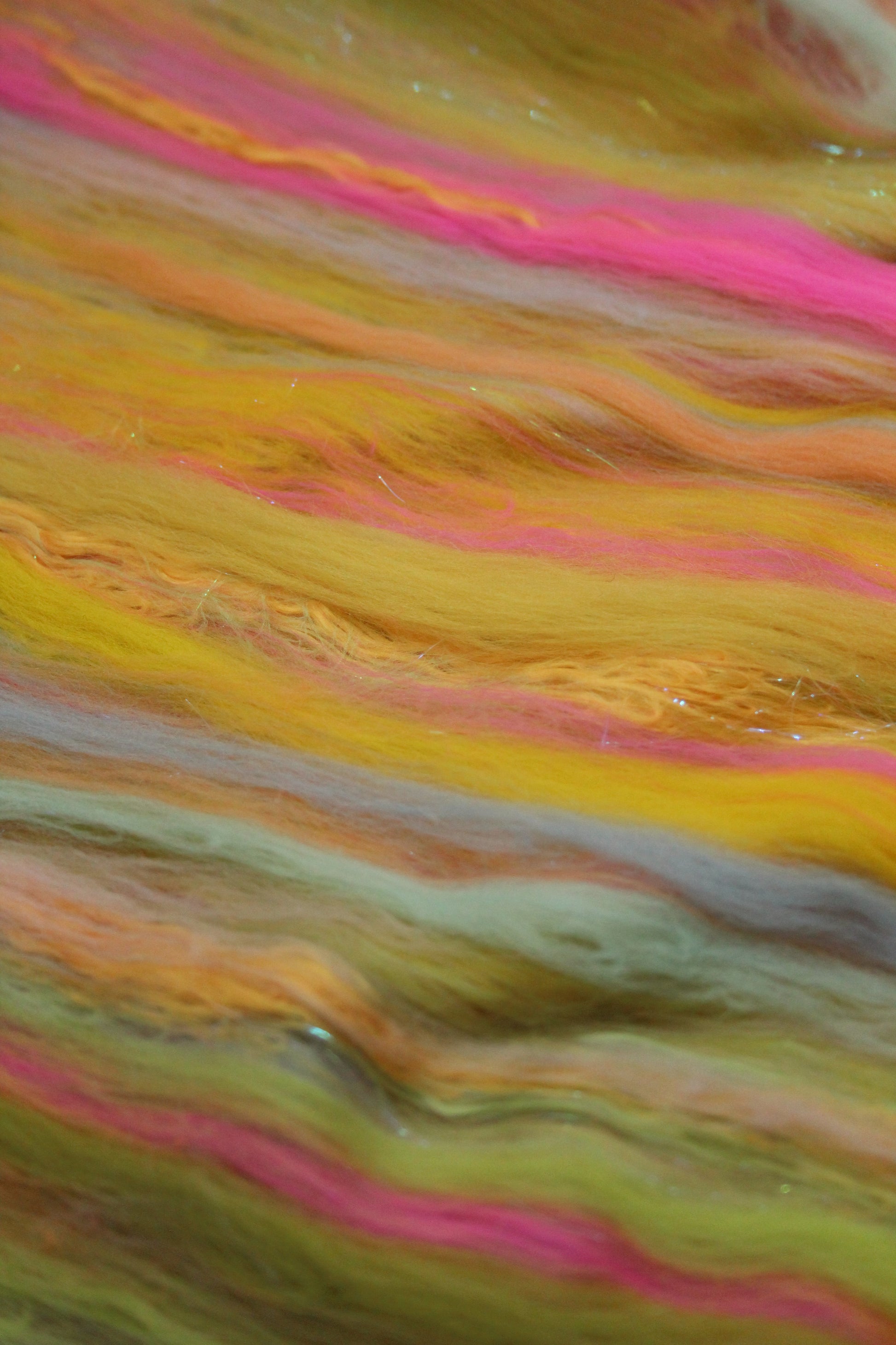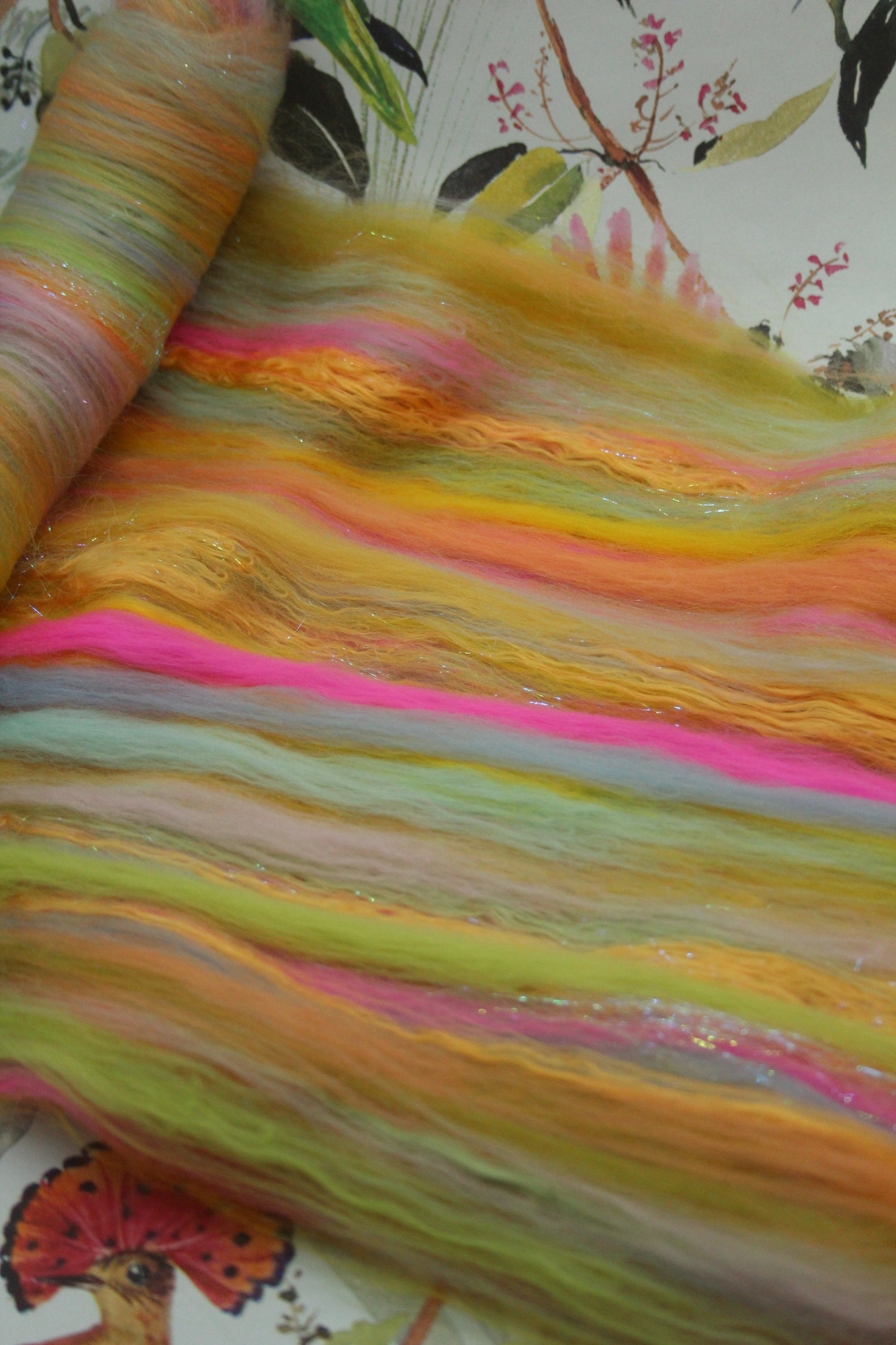 This is a batt that I have created by drum carding wool and speciality fibres. This would be perfect for so many projects - leave it whole and wet felt to create a beautiful background for embellishing, split and hand spin into a beautiful yarn, pull sections off and lay them down for wet felting into something fantastic like a bag, needle felt a fun 3D creature, weave into a wall hanging....