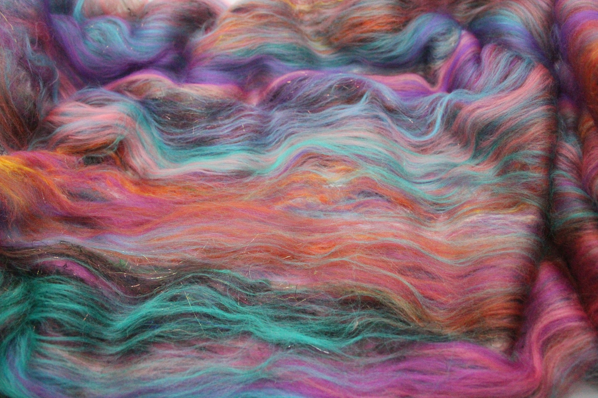 This is a batt that I have created by drum carding wool and speciality fibres. This would be perfect for so many projects - leave it whole and wet felt to create a beautiful background for embellishing, split and hand spin into a beautiful yarn, pull sections off and lay them down for wet felting into something fantastic like a bag, needle felt a fun 3D creature, weave into a wall hanging....