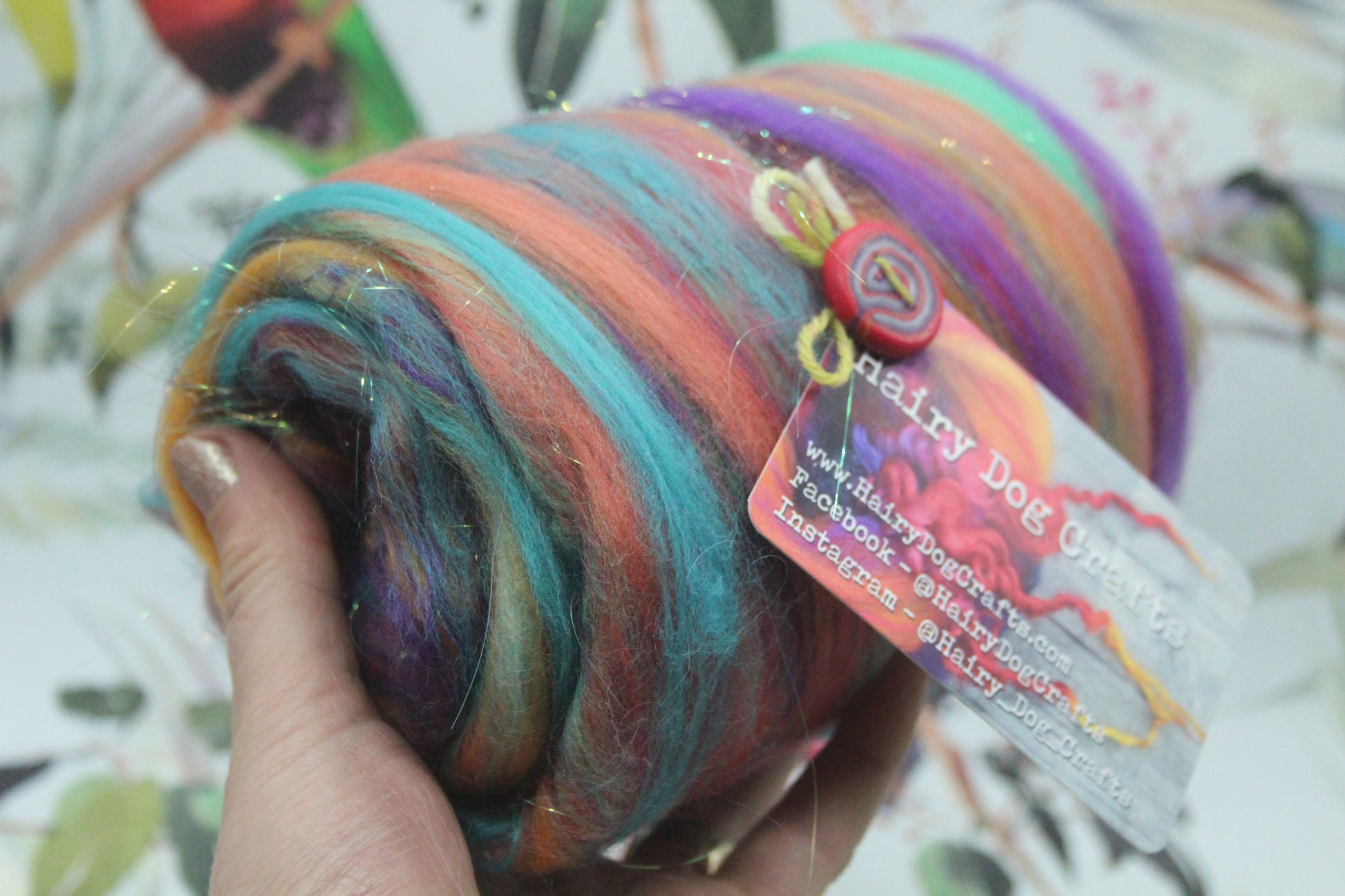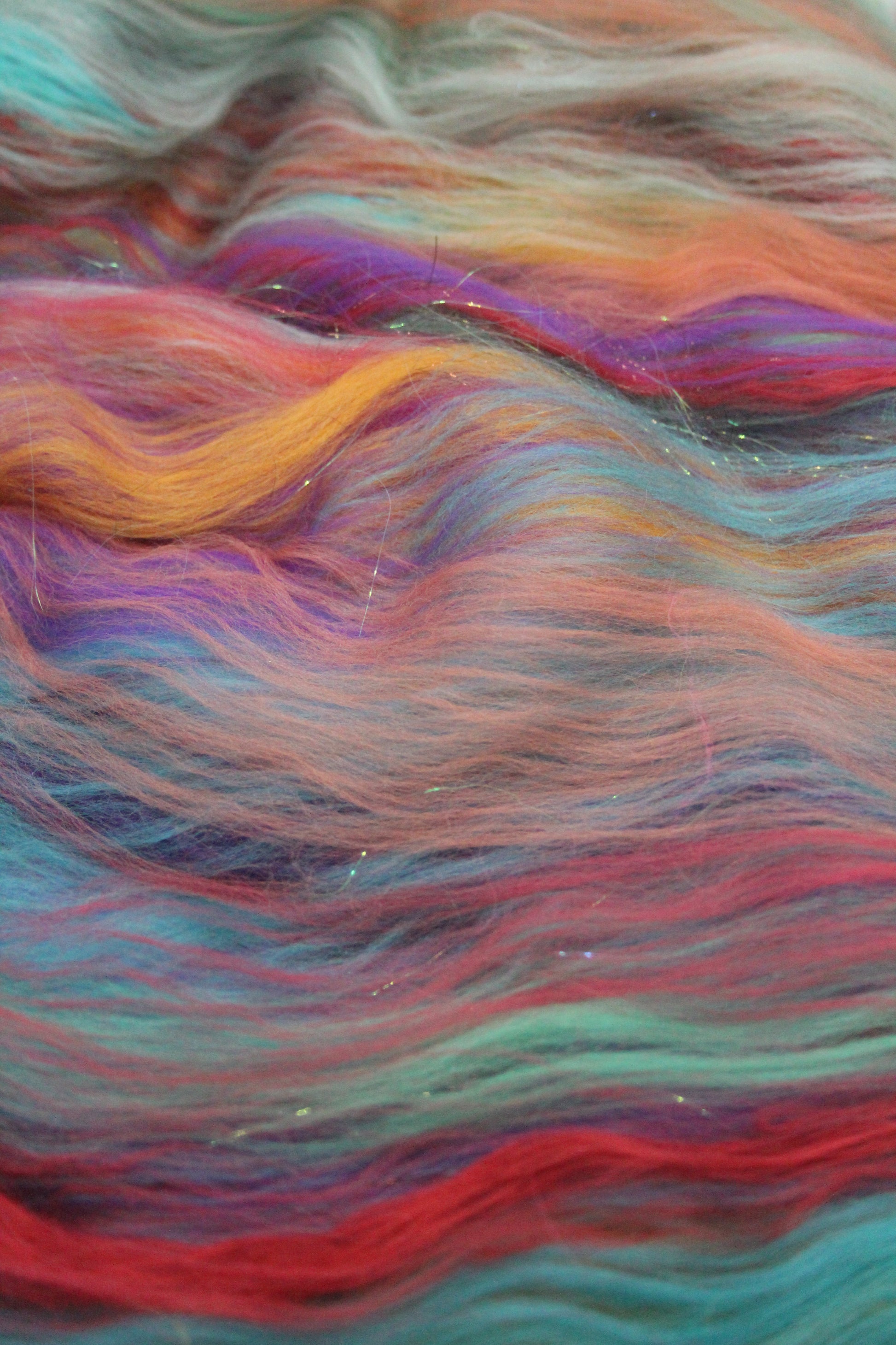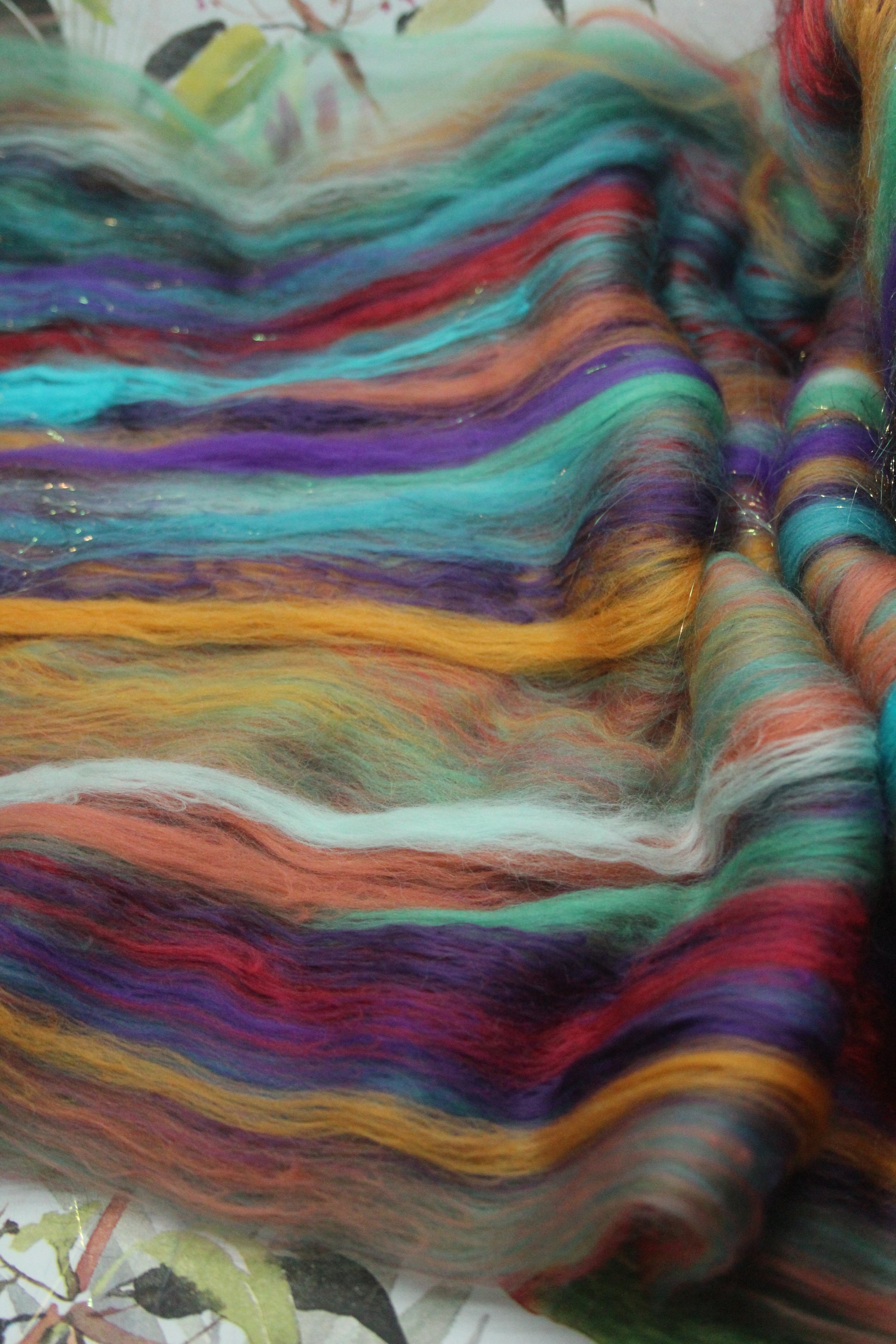 This is a batt that I have created by drum carding wool and speciality fibres. This would be perfect for so many projects - leave it whole and wet felt to create a beautiful background for embellishing, split and hand spin into a beautiful yarn, pull sections off and lay them down for wet felting into something fantastic like a bag, needle felt a fun 3D creature, weave into a wall hanging....